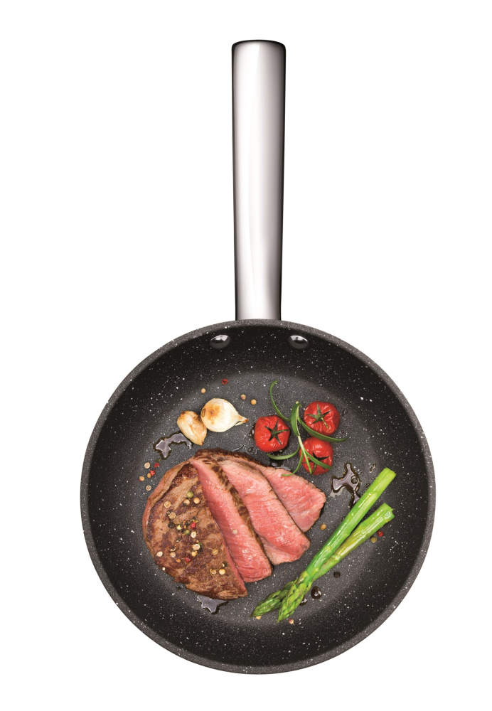 Stegepande med revolutionerende 3D belægning. En belægning med struktur i overfladen, som gør det endnu lettere at stege perfekt uden af maden brænder fast på panden. 3D belægningen er så slidstærk at der er muligt at bruge alle typer redskaber på panden ? også metalredskaber. Panden har en kraftig bund som fordeler varmen perfekt, og er udstyret med metalhåndtag som kan gå direkte i ovnen. Maden kan derfor brunes af på panden og færdiggøres i ovnen uden at flytte maden over i et fad eller skål.