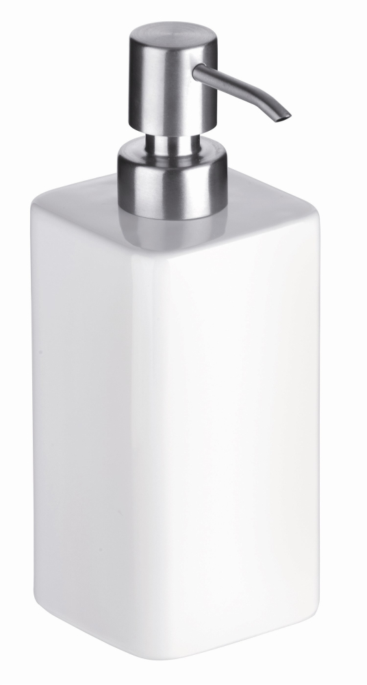 Fremstillet i hvid keramik med pumpe i rustfri stål. Pumpen er 18 cm høj og måler 6,5 x 6,5 cm.