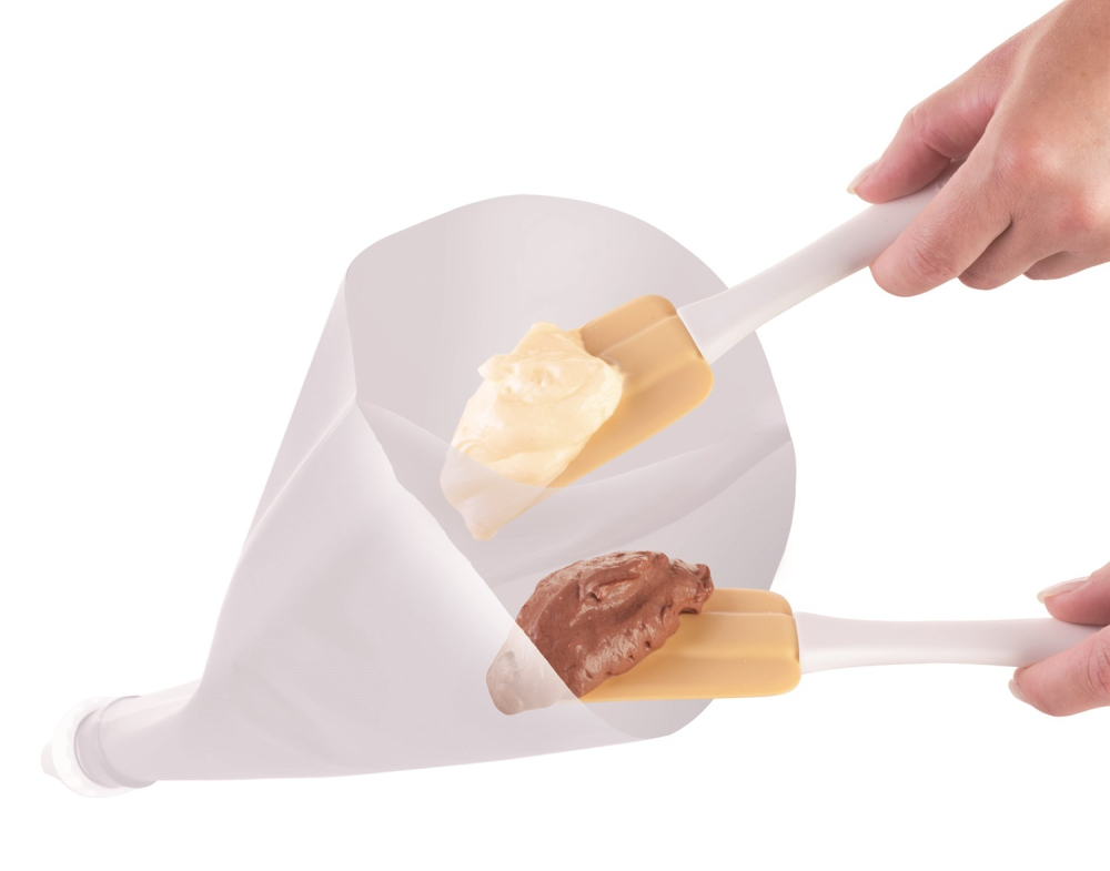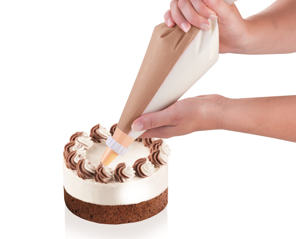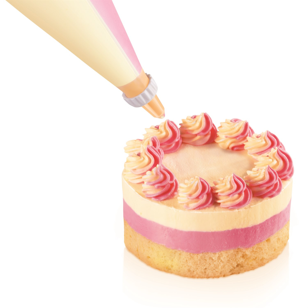 Den fleksible og elastiske sprøjtepose med dobbeltkammer er fremragende til to-farvet udsmykning. Passer til brug med