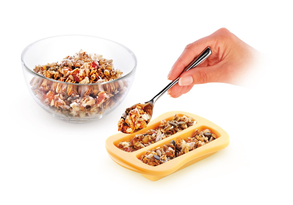 643188) kan du købe 3 ekstra silikoneforme her. Du kan lave energibarer der enten skal bages let i ovnen eller være "raw" og blot blandes og lægges på køl.