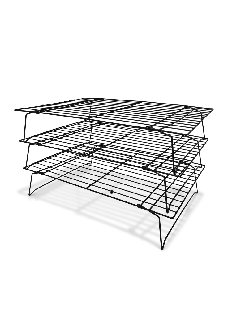 Disse smarte afkølingsriste giver masser af plads til at afkøle dit bagværk eller chokolade, men fylder minimalt når de efterfølgende skal pakkes væk. Hver rist måler 34 x 24 cm, og samlet er de 3 etager 19,5 cm høje.