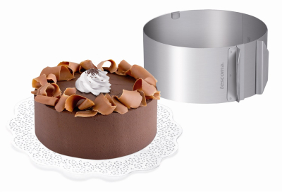 Justerbar kagering til kager, tærter islagkager og desserter. Kan justeret til en diameter fra 16 cm til 30 cm. Kan bruges enten til at bage kager i eller samle en kage med flere bunde og lag. Kan bruges i almindelig ovn, varmtluft ovn og gas ovn. Kan også tåler at komme i fryser og tåler rengøring i maskinopvask. Højden er 8,5 cm