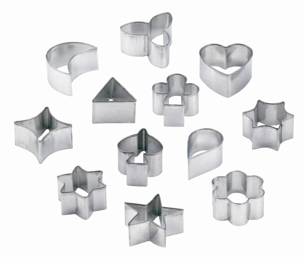 Udstikker sæt i metal med 12 forskellige klassiske motiver som kan bruges til både kagedej, småkager, marcipan og fondant. De er let at bruge og giver et rigtig flot resultat som du efterfølgende selv kan dekorere. Formene måler ca. 4 cm. i diameter.