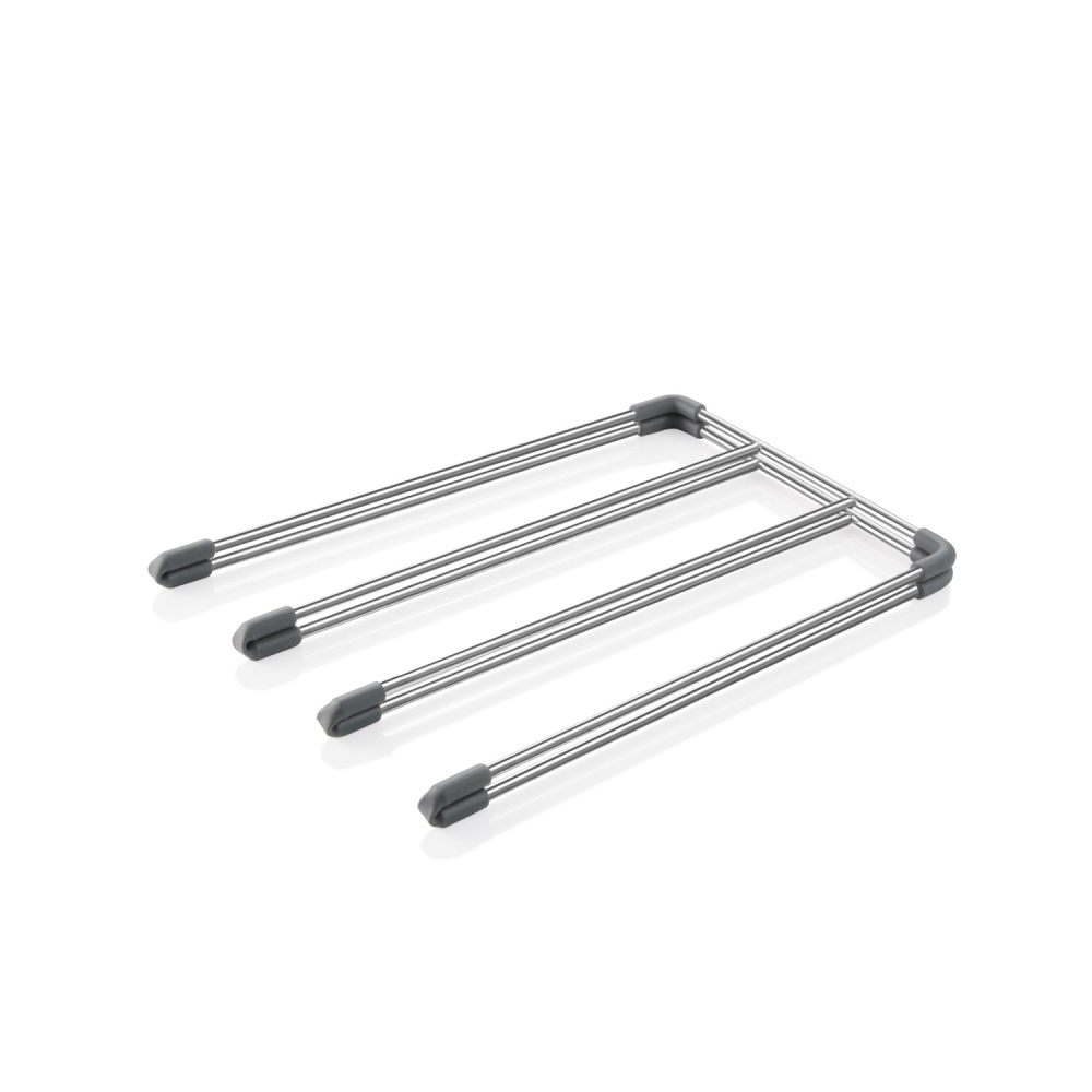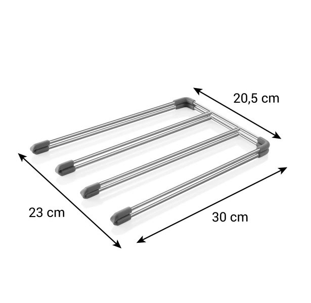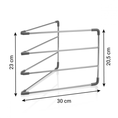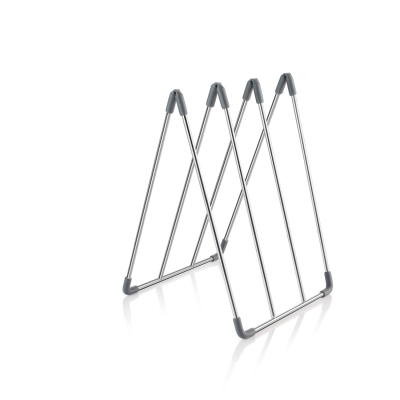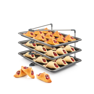 Med dette smarte stativ til bageplader har du mulighed for at placere flere bagplader på meget lidt plads. Stativet er beregnet til 3 bageplader med bagværk kan stilles hævning og afkøling. Men stativet til bageplader er også smart til opbevaring af bageplader. Her kan bagepladerne opbevares lodret eller vandret. Alt efter hvad er passer dig bedst. Endelig kan stativet bruges som bordskåner i køkkenet til gryder og pander, da de smarte hjørner med silikone, gør at bageplader, men også gryder og pander står sikkert.