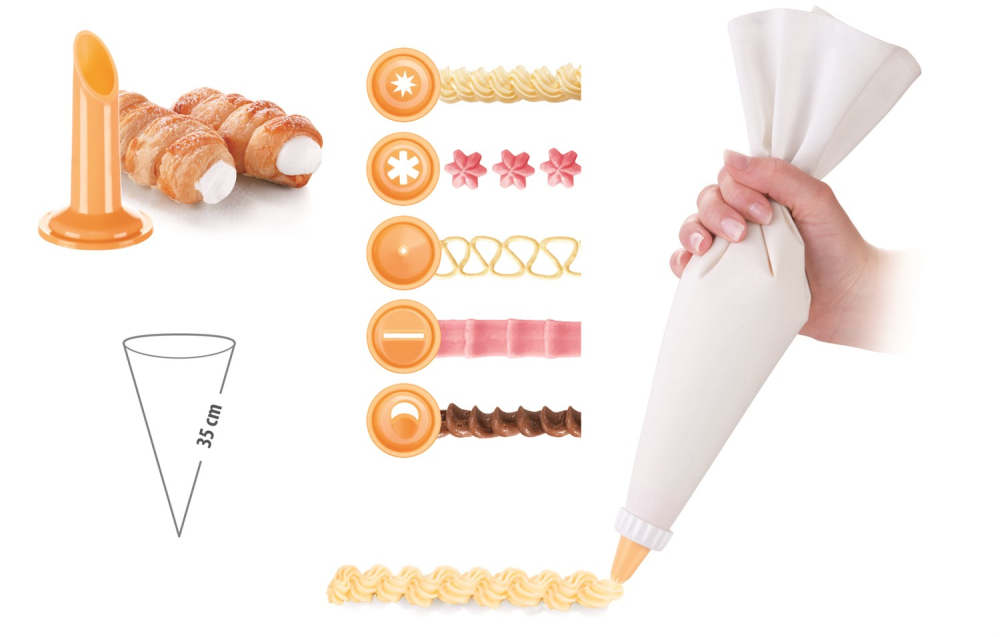 Sprøjtepose i tekstil med 6 forskellige tyller som gør det muligt at lave flotte og festlige dekorationer eller Macarons. Sprøjtepose kan rengøres og genbruges og er dermed praktisk og altid klar til brug.