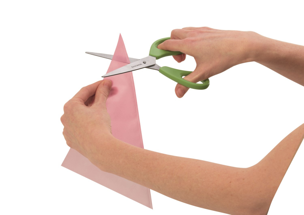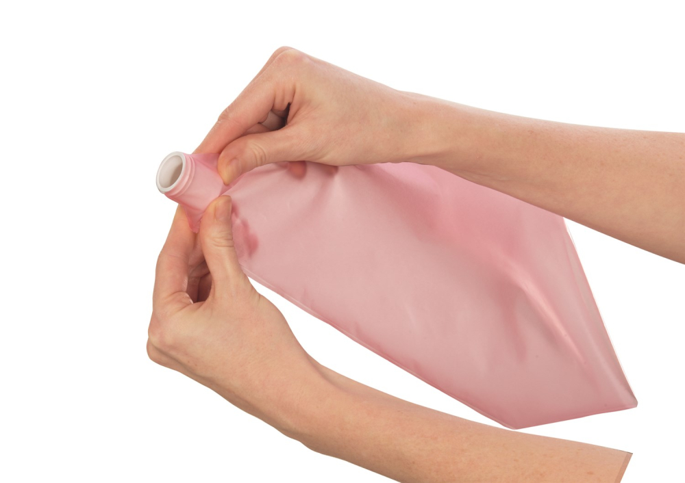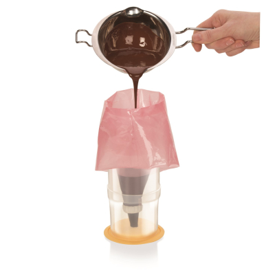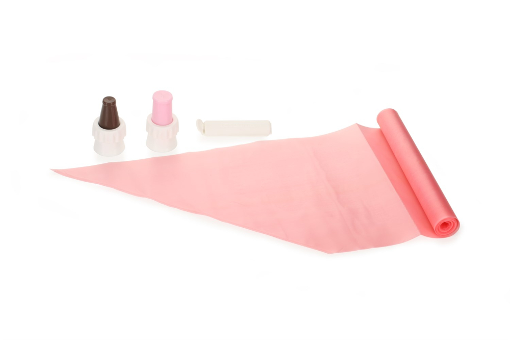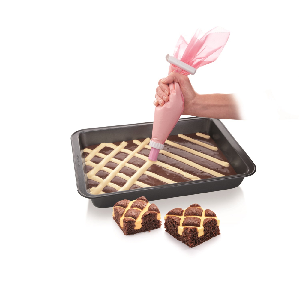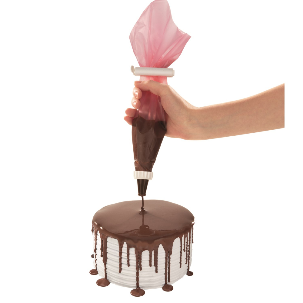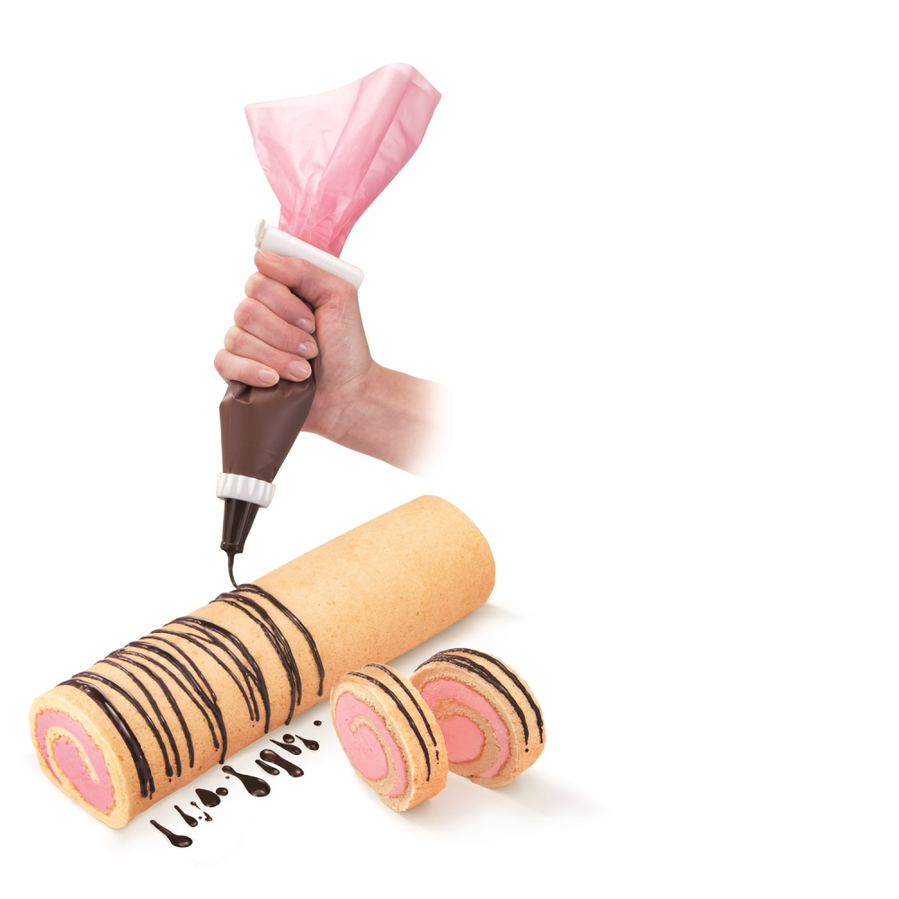 Den fleksible selvlukkende tylle forhindrer posens indhold i at løbe ud når man i færd med at dekorere eller fylde en kage, dessert eller lignende. Den brune tylle er ideel til chokoladebelægning, balsamisk dressing, glasur, frugt topping osv., Den lyserøde tylle er til ostemasse og cremede cremer, tynde deje, flødeskum, smør creme, mayonnaise osv. Den ikke-klæbende overflade inde i posen og non-stick overfladen gør det lettere at dekorere. Dyserne tåler maskinopvask. Posen tåler ikke maskinopvask.
