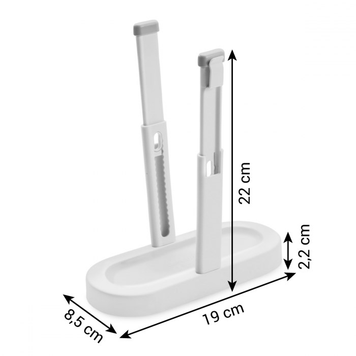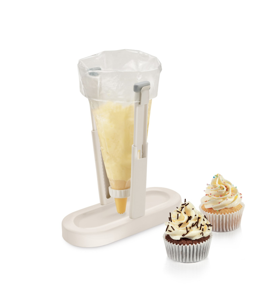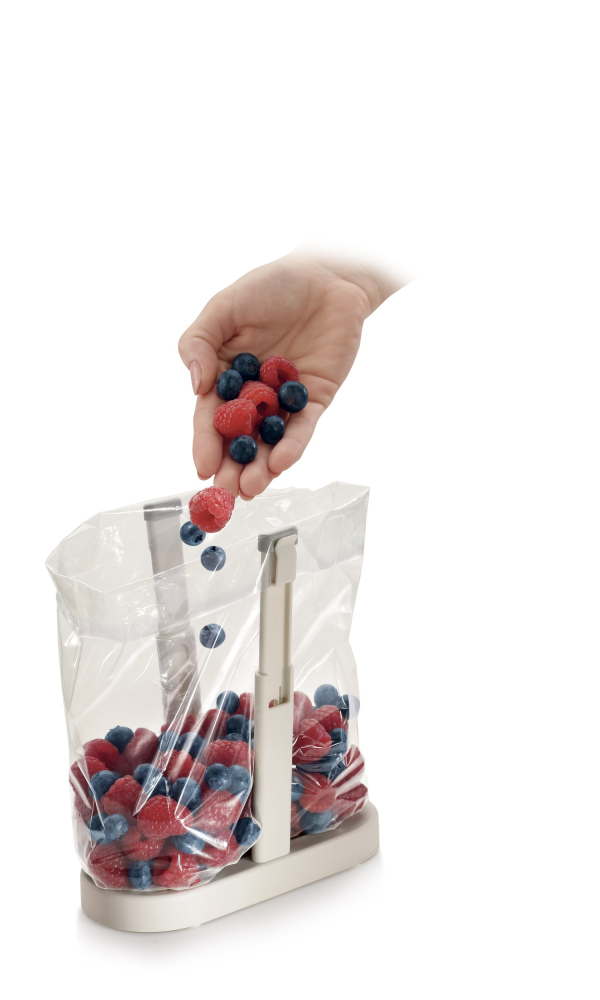 Kender du problemet? Du skal fylde en plastpose med mad, frugt eller sprøjtepose med kagefyld og har brug for begge hænder fri til denne opgave. Dette løser denne smarte poseholder. Du placere posen i holderen og har begge hænder fri til at fylde posen. Holderen kan indstilles i højden fra 12 til 20 cm. Når holderen ikke er i brug kan den lukkes sammen.