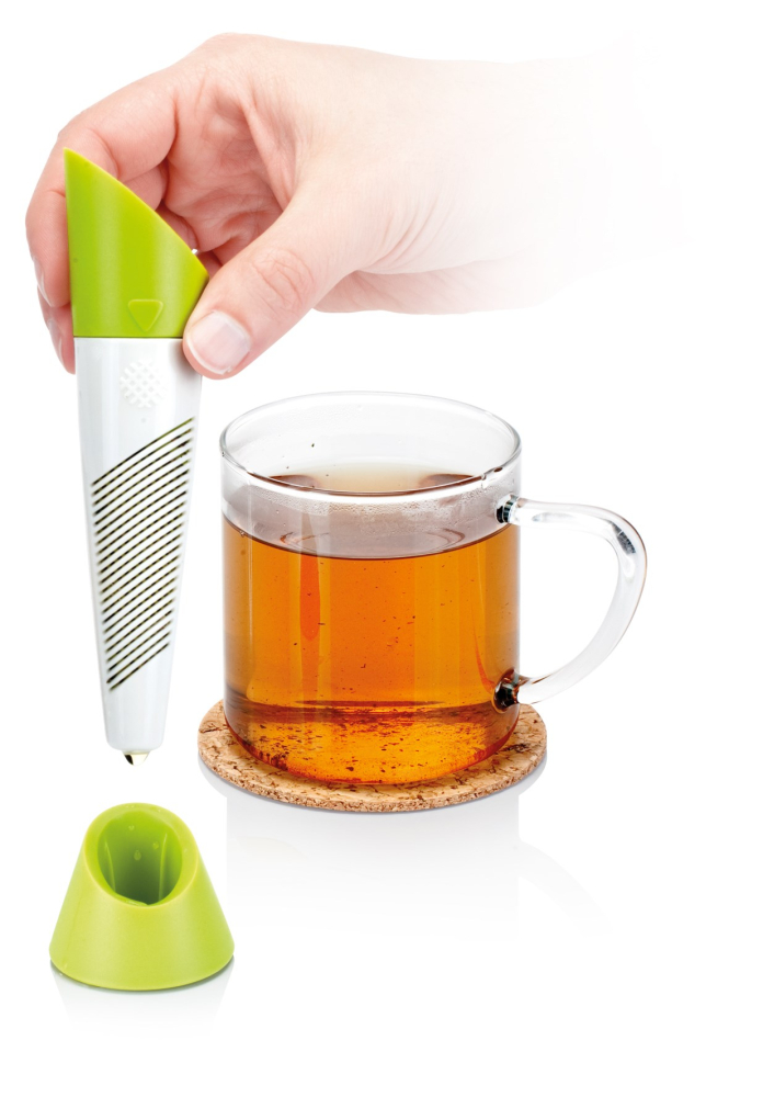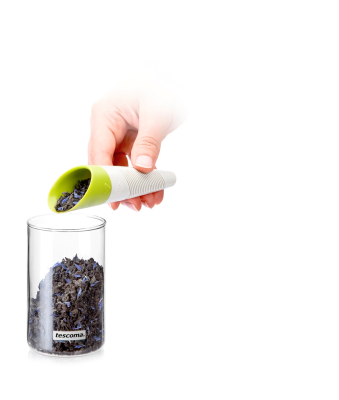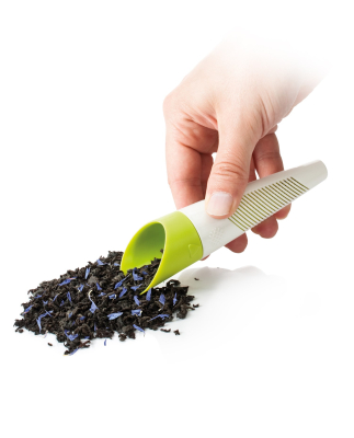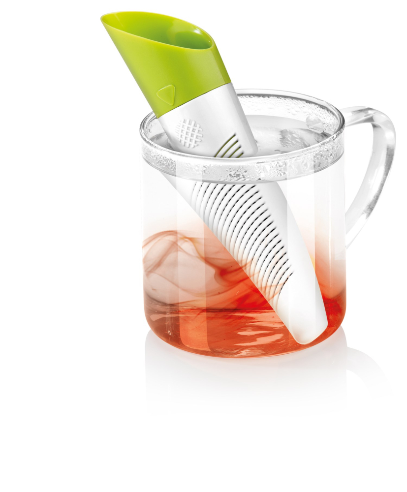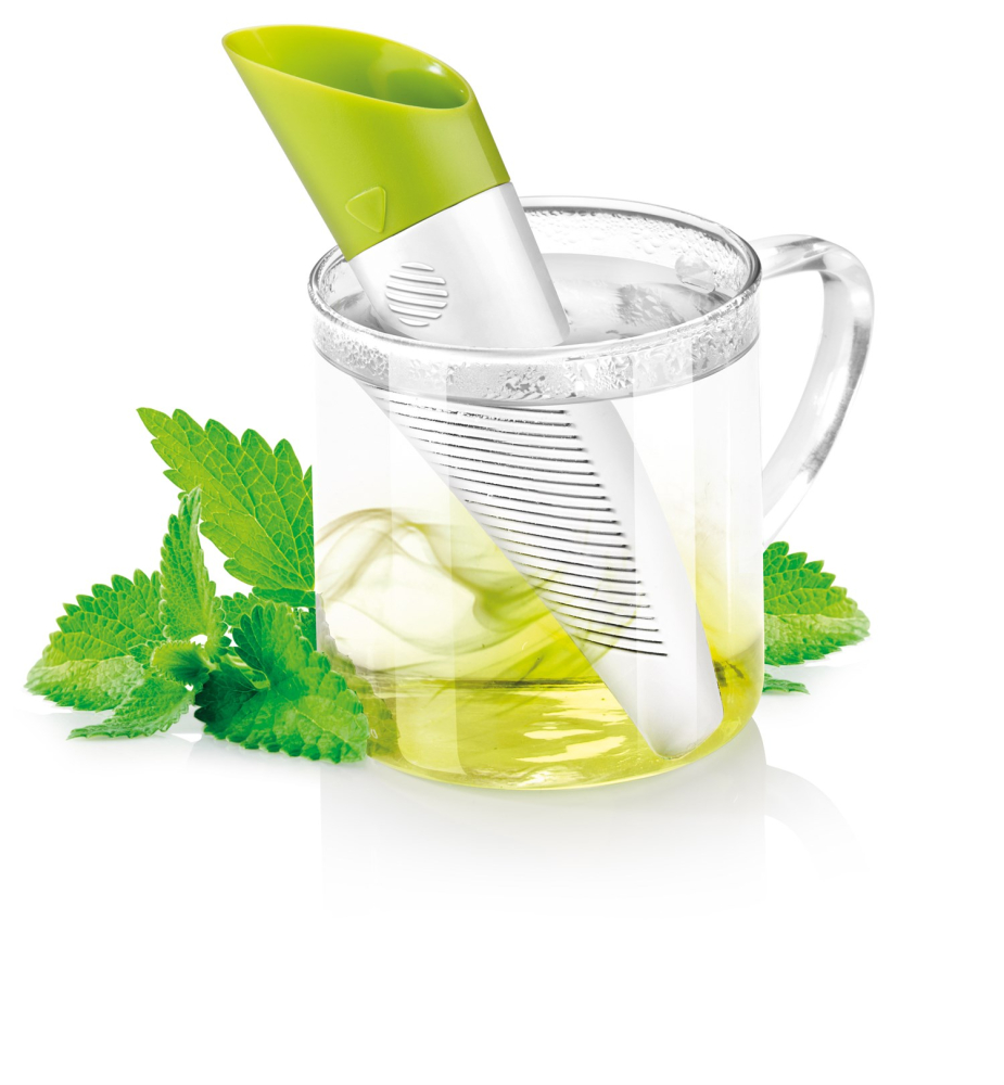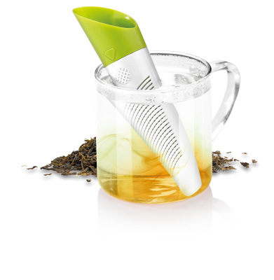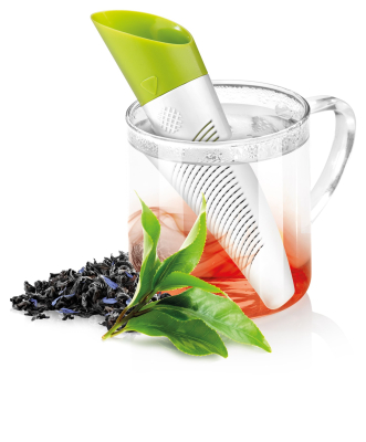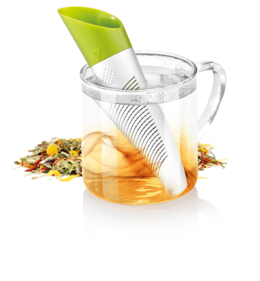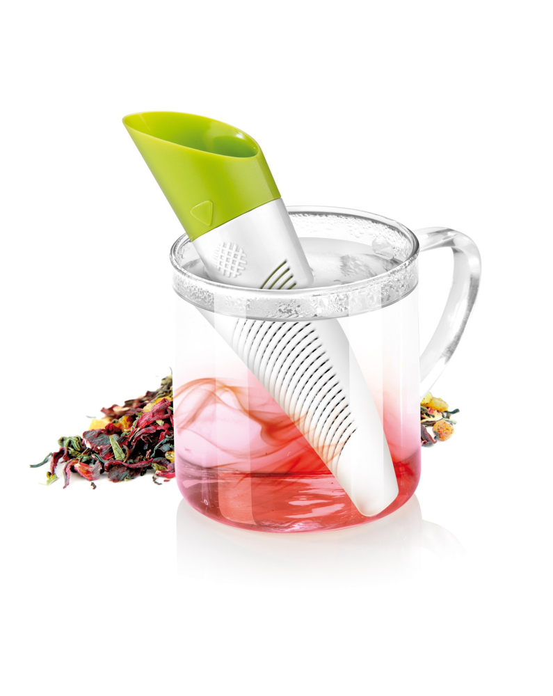 Tefilter til både tørret te og friske urter. Filteret er smart designet så det kan brues som doseringsske. Tefilteret kan også indstillet til brug med tørret te eller friske urter. Endelig medfølger der en smart folder til at stille filteret i efter brug så det ikke ligger og drypper på bord eller dug. Højden på tefilteret er ca. 15 cm.