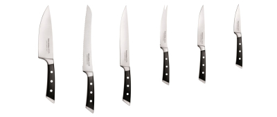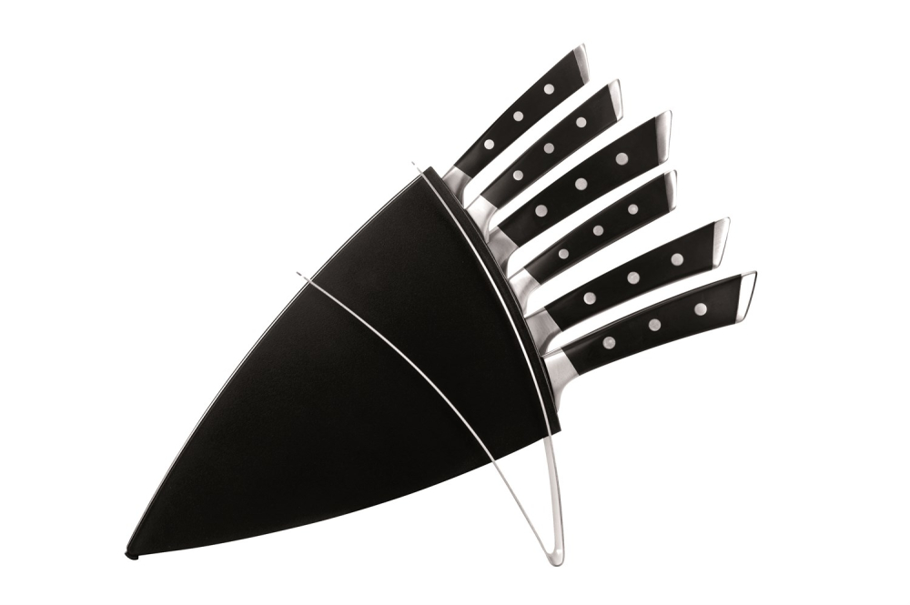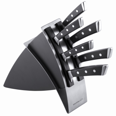 Hver enkelt kniv er fremstillet  af et enkelt stykke af høj kvalitet japansk rustfrit stål med et slidstærk klinge, perfekt skærekant og ergonomisk håndtag med faste nitter. Kvalitets køkkenknivene opbevares i en knivblok fremstillet af stærkt resistent plast og rustfrit stål. Beregnet til professionel og privat brug, og leveres i flot gaveæske