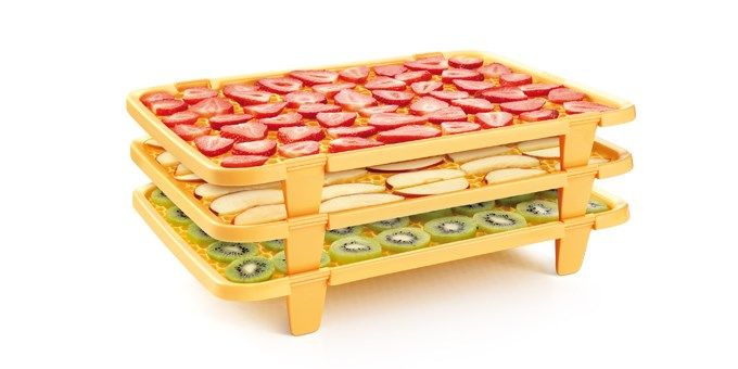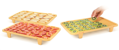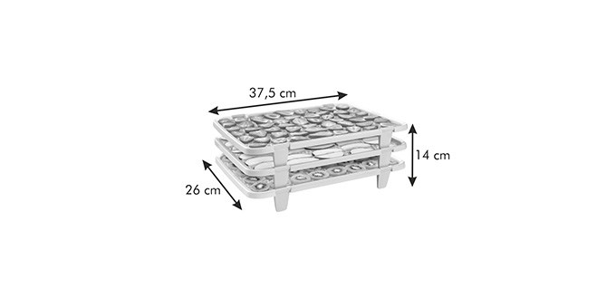 Smart stativ til tørring af frugt, grøntsager, svampe, kød, hjemmelavet pasta osv. Sættet består af 3 bakker som kan bruges i både alm. og varmluftovn. Men ikke i gasovn. Temperatur i ovn må maksimum være 70 grader ved brug at stativet. Bakkerne står oven på hinanden, når de benyttes, og kan klappes sammen efter brug for at spare plads. Kan også benyttes uden brug af ovn, i et mørkt, køligt og tørt lokale, hvis man har behov for dette. De 3 bakker måler udfoldet 37,5 x 26 x 14 cm. Tåler makinopvask.