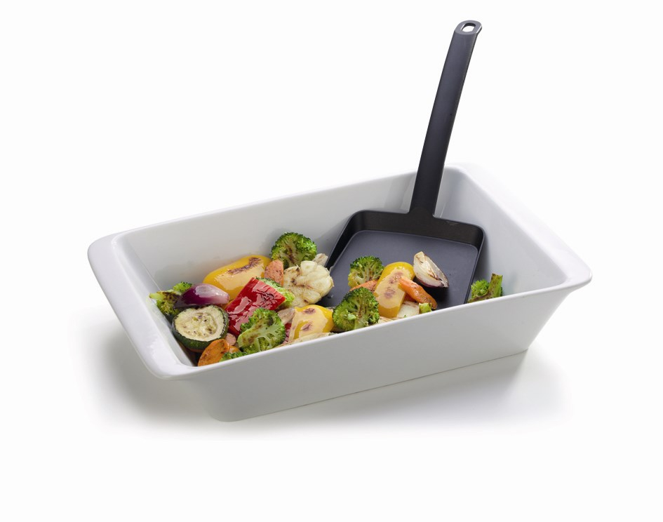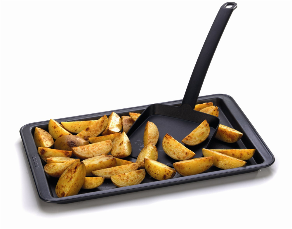 Fremragende til at opsamle pommes frites, bagte kartofler, ristede kartofler, lasagne, kødboller osv. Fra bageplader, stegepander og riste. Velegnet til alle typer køkkengrej, fremragende især til køkkengrej med non-stick belægning da den ikke beskadiger belægningen. Lavet af fremragende varmebestandig nylon. Modstandsdygtig op til 210 ° C. Tåler opvaskemaskine. Måler 14 cm i bredden og 33 cm i længden