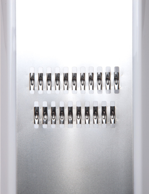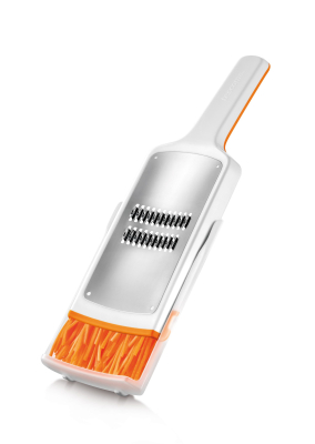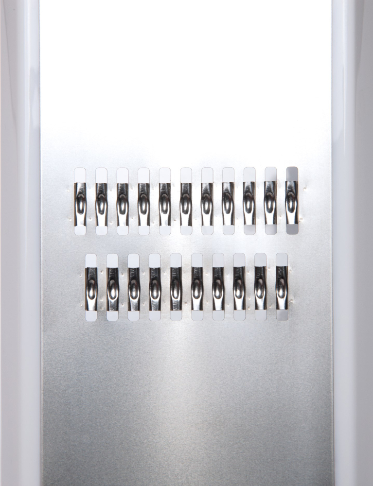 Ekstra skarpe, modstandsdygtige blade af rustfrit stål af høj kvalitet til fremstilling af fine julienne-strimler af gulerødder, selleri, kartofler, hvid radise osv. Beskyttelsesbeskyttelsen fungerer også som et reservoir for de revne ingredienser. De ekstra skarpe, modstandsdygtige klinger er af rustfrit stål af høj kvalitet.
