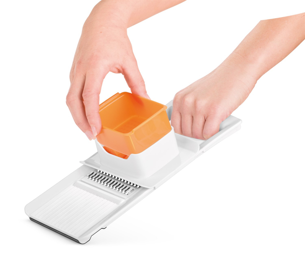 Advarsel! Rivejernets knive er ekstremt skarpe. den medfølgende slæde beskytter knivene når du ikke bruger rivejernet, men slæden gør også at man kan bruge hele grøntsagen man river uden at få revet fingerspidserne.