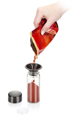 Til denne krydderi karrusel medfølger også en lille tragt, så du er sikker på at der ikke går krydderier til spilde når du fylder dine krydderi glas. Denne smarte tragt er indbygget i krydderi karrusellen, så du altid har den lige ved hånden, og så den ikke bliver væk. Det er rigtig smart.