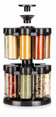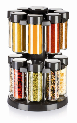 Kært barn har mange navne, men med denne krydderi karrusel har du et let og overskuleligt overblik over alle dine tørrede eller frysetørrede krydderier. Krydderi karrusellen består af 2 etager med hver 8 glas. Til hvert glas medfølger plastic top med henholdsvis 1 eller 7 huller, som gør at uanset hvilet krydderi du vælger at hælde i de medfølgende krydderi glas, har du efterfølgende styr på dosering. Du kan selvfølgelig også lade være med at sætte de medfølgende plastic toppe på, hvis det er ekstra store krydderi produkter du har i glasset, for det medfølgende låg slutter helt tæt, og gør at aroma og smag fra krydderierne bibeholdes indtil de skal bruges.