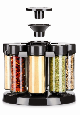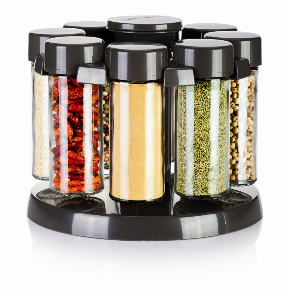 Kært barn har mange navne, men med denne krydderi karrusel har du et let og overskuleligt overblik over alle dine tørrede eller frysetørrede krydderier. Krydderi karrusellen består af 8 glas. Til hvert glas medfølger plastic top med henholdsvis 1 eller 7 huller, som gør at uanset hvilet krydderi du vælger at hælde i de medfølgende krydderi glas, har du efterfølgende styr på dosering. Du kan selvfølgelig også lade være med at sætte de medfølgende plastic toppe på, hvis det er ekstra store krydderi produkter du har i glasset, for det medfølgende låg slutter helt tæt, og gør at aroma og smag fra krydderierne bibeholdes indtil de skal bruges.