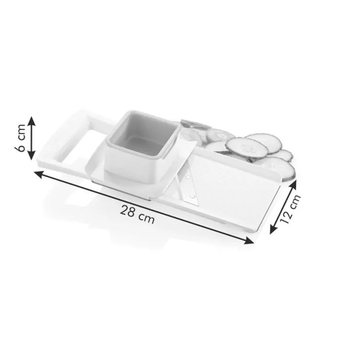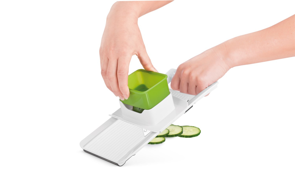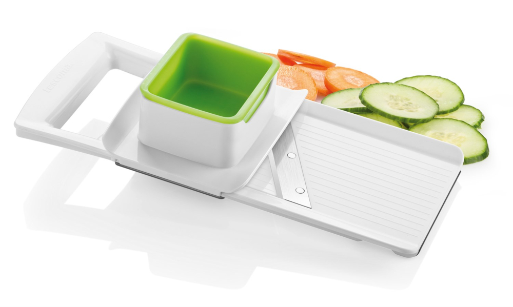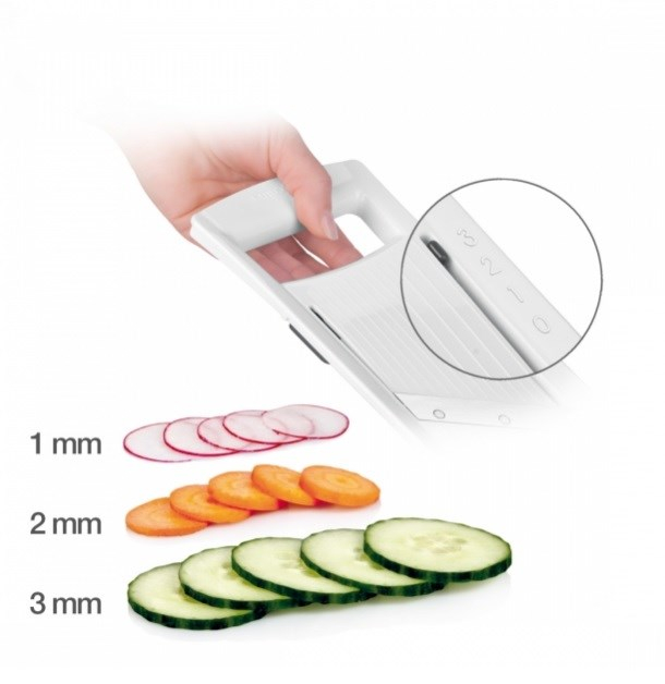 Med dette smarte mandolinjern fra Tescoma, kan du snitte dine grøntsager i den tykkelse du ønsker. Skæret på mandolinjernet kan indstilles til 3 tykkelser: 1 mm, 2 mm eller 3 mm. Derudover er der på undersiden smarte udskæringer som gør at mandolinjernet ligger sikkert, hvis du bruger en skål som opsamler, mens du snitter. Dette kan du se på videoen nedenfor.