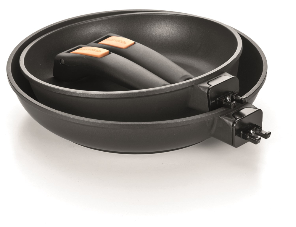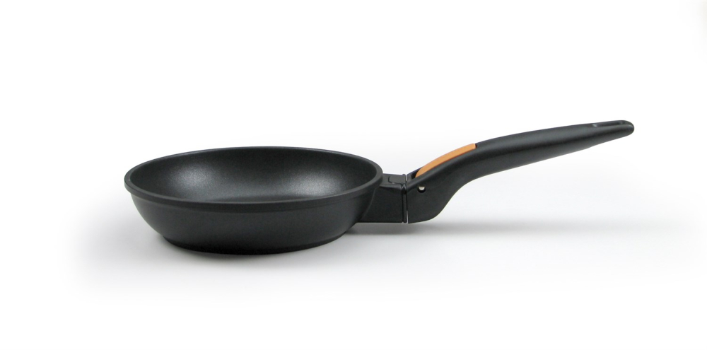 Når du sætter denne pande på plads i køkkenskabet eller skuffen, kan du med fordel klikke håndtaget af for at spare plads. Smart og praktisk :-) og belønnet med "German design award" i 2017.