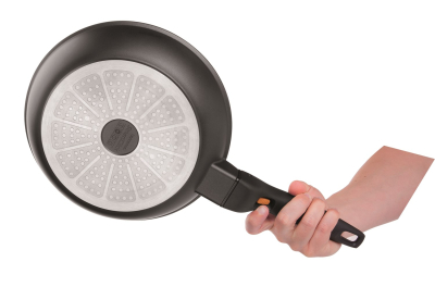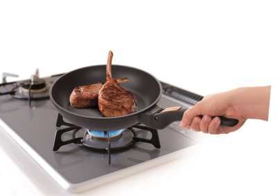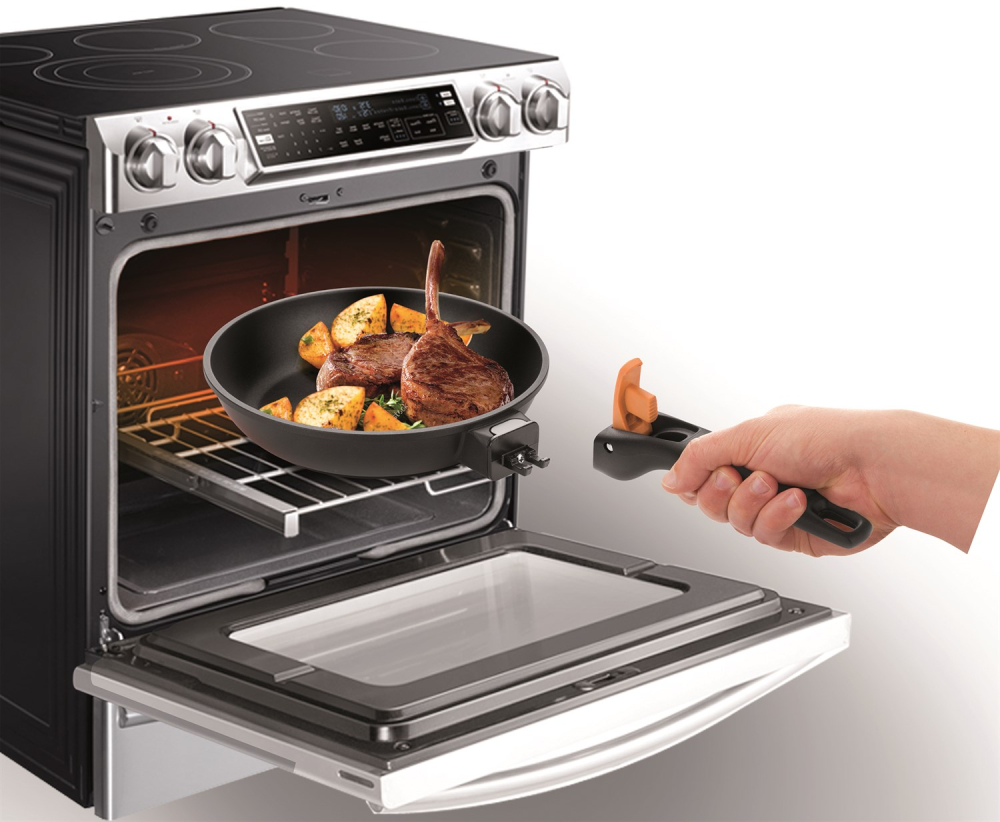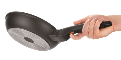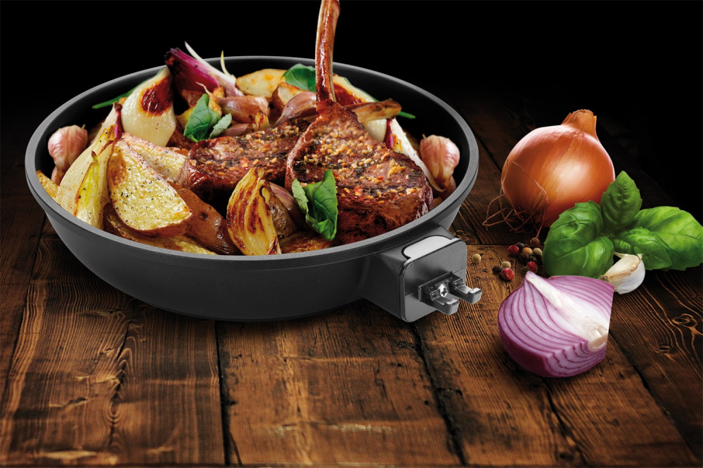Panden er med aftageligt håndtag som gør at man kan brune kød eller fisk på panden og færdiggøre den i ovnen. Man klikker håndtaget af når panden er placeret i oven. Håndtaget bliver dermed ikke varmt. Samtidig fylder panden ikke hele ovnen, så der er muligt at stille andet ved siden af.