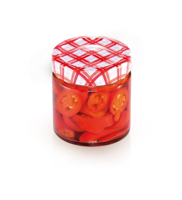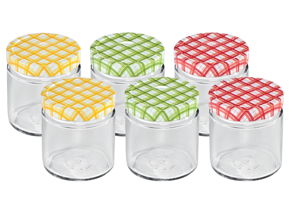 Glas til henkogning og opbevaring af f.eks. hjemmelavet marmelade etc. Sættet består af 6 glas med låg i 3 forskellige farver. Låget er med et såkaldt twist-off skruelåg med "klik"-funktion til henkogning og pasteurisering ved maks. 95 grader. Låget er ikke egnet til olieholdige produkter.