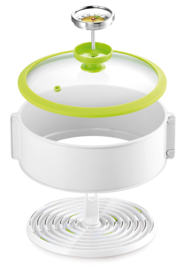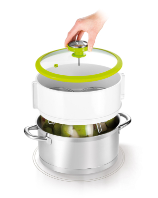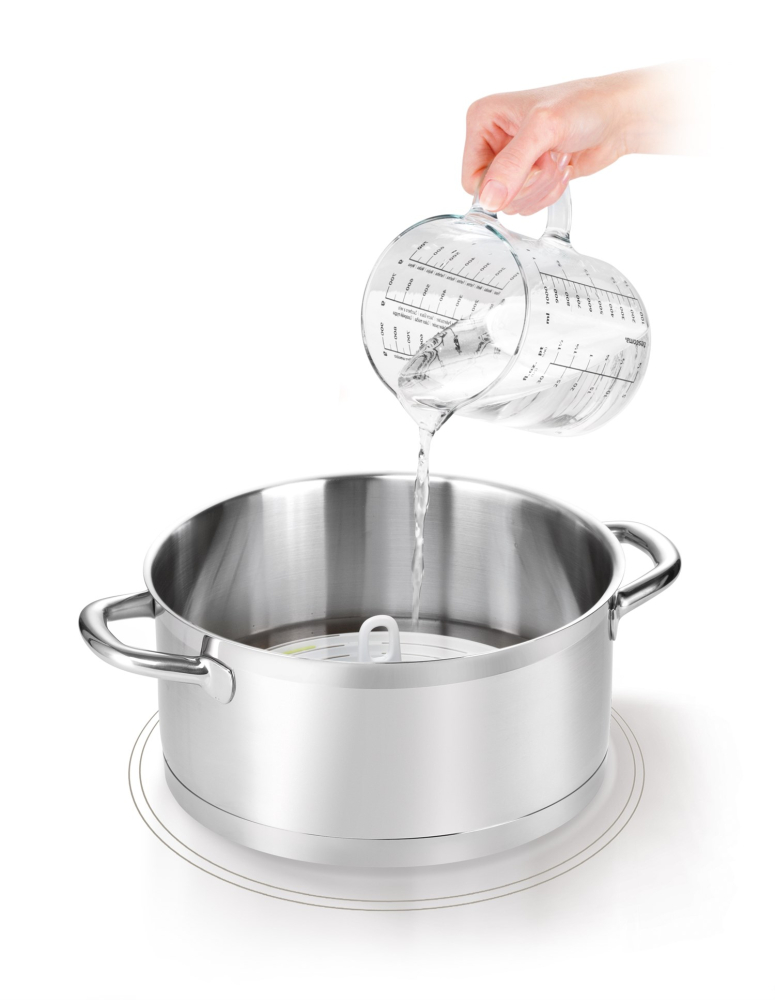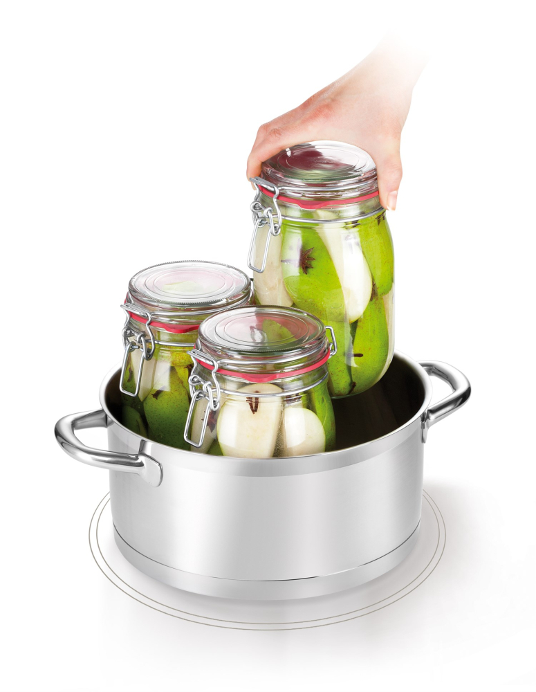Fremragende til let konservering og sterilisering af mad med damp. Glaslåget har et nøjagtigt termometer til let kontrol af temperatur og krukker under konserveringsprocessen. Sien i bunden af indsatsen beskytter krukkerne mod den høje temperatur i bunden af gryden.