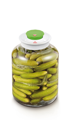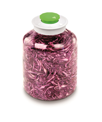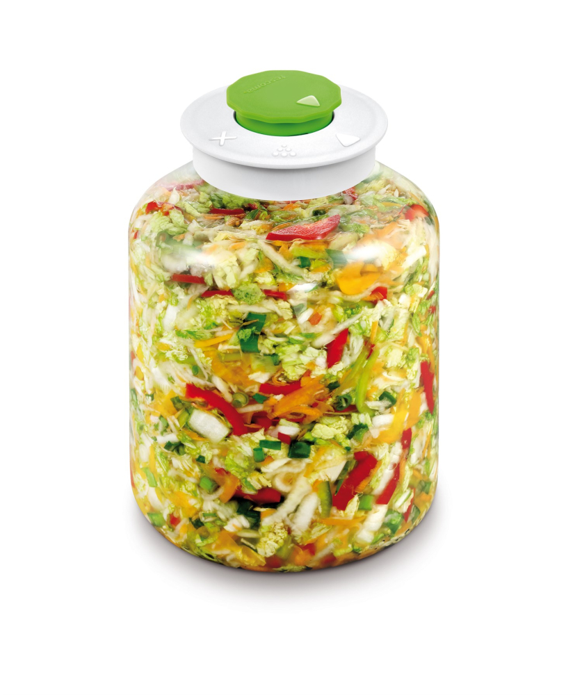 Fermentering bliver let med denne flotte fermenteringskrukke i glas der er udstyret med en special låg. Det hermetiske låg med ventil frigiver trykket, der dannes under fermenteringsprocessen uden at lade luft komme ind i krukken. Fremragende til nemt at tilberede fermenterede produkter af alle slags. Tryksten kan købes