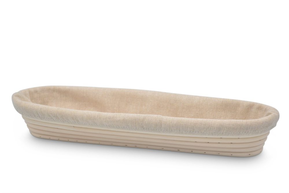 Denne aflange hævekurv i rattan/peddigrør, bruges til hævning af flutes og giver et flot mønster på aflang facon på brødet. Arbejde du med fugtige deje, er det er fordel at bruge det aftagelige klæde så dejen ikke hænger fast i kurven under hævning. Uanset om du bruger kurven med eller uden klæde er det en fordel at drysse med rismel inden dejen lægges til hævning. Rismel bliver ikke fugtigt og absorberes derfor ikke i dejen, men giver en flot overflade på brødet. Kurven børstes ren med en stiv børste efter brug, eller tørres af med en hårdt opvredet klud. Kurven kan ikke tåle at blive vasket op med sæbe og under rindende vand.