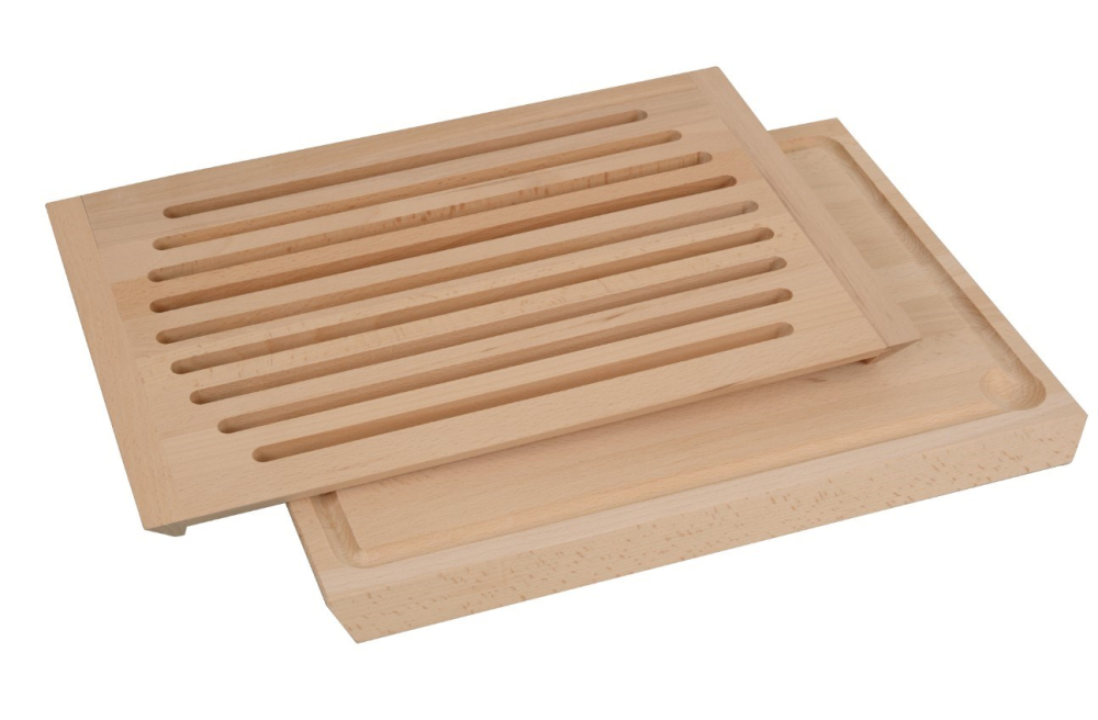 Øverst er en "rist" med riller så brødkrummer flader igennem og samles på det nederste bræt. Det nederste bræt er udstyret med saftrille og kan derfor også benyttet som forskærerbræt til kød og grøntsager, eller som et dejligst stort spækbræt i køkkenet.